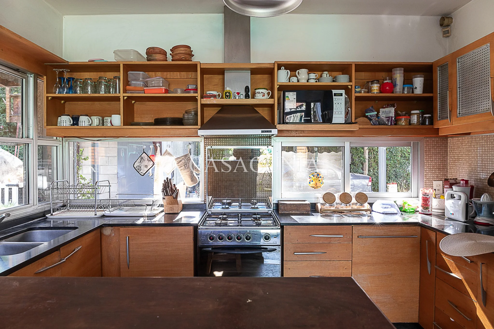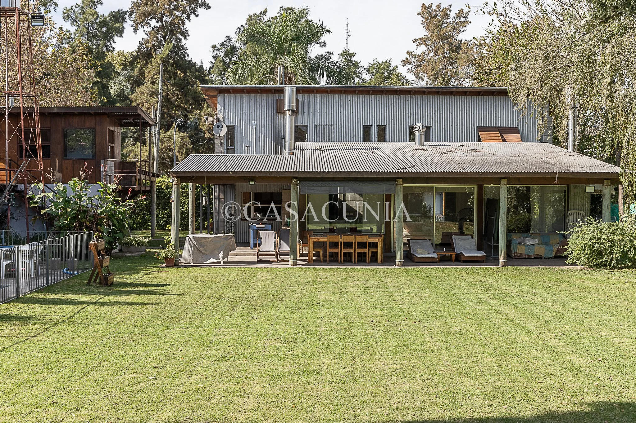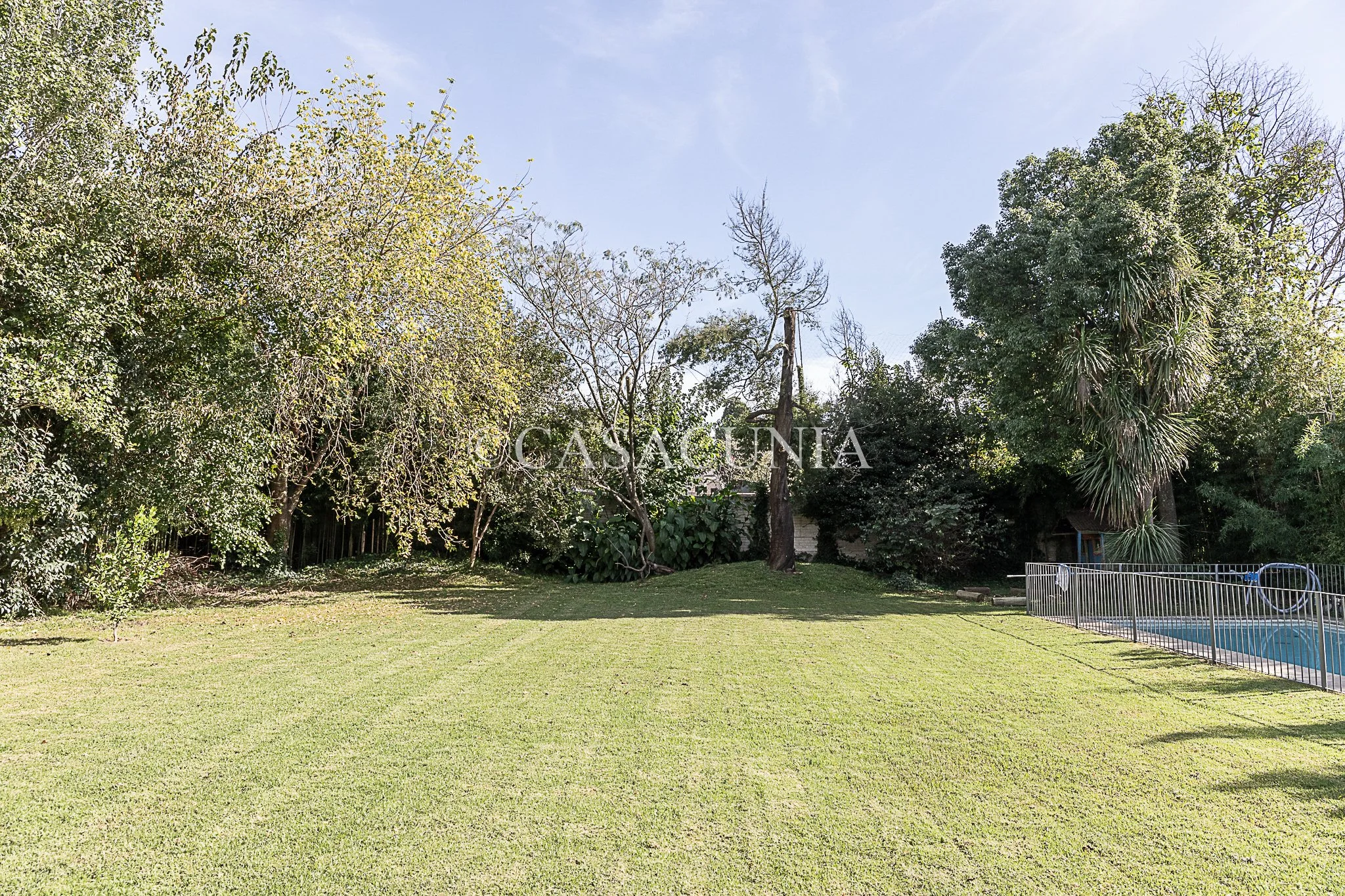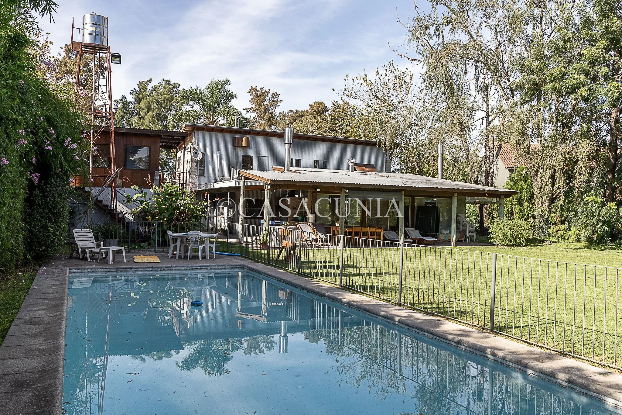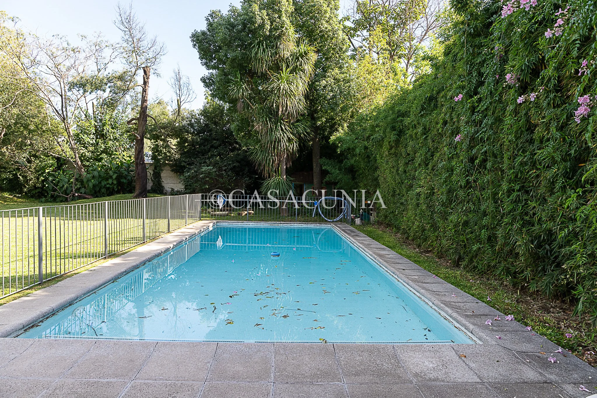 Casa con amplio jardín arbolado, pileta cercada y galería. Estacionamiento techado.